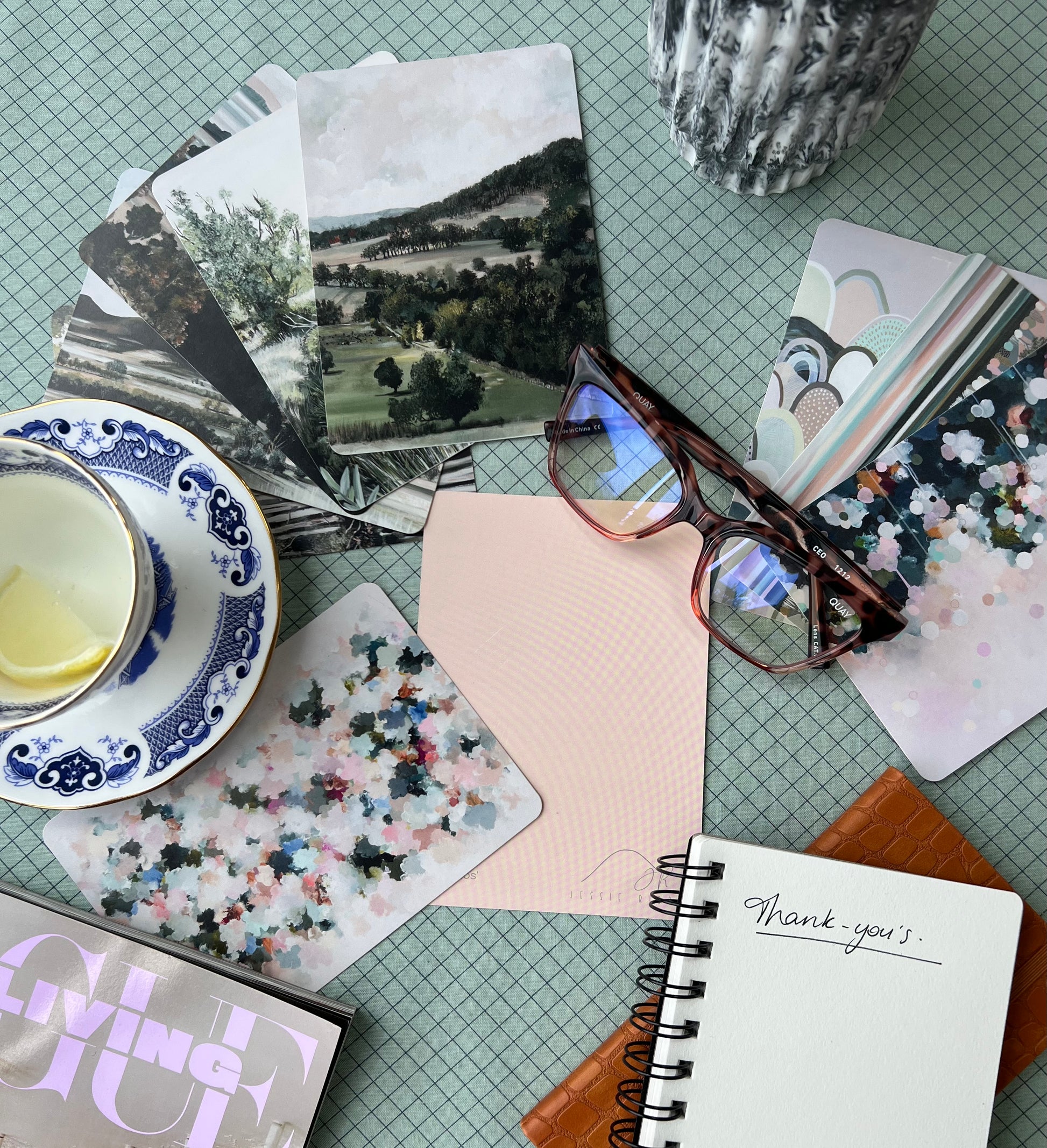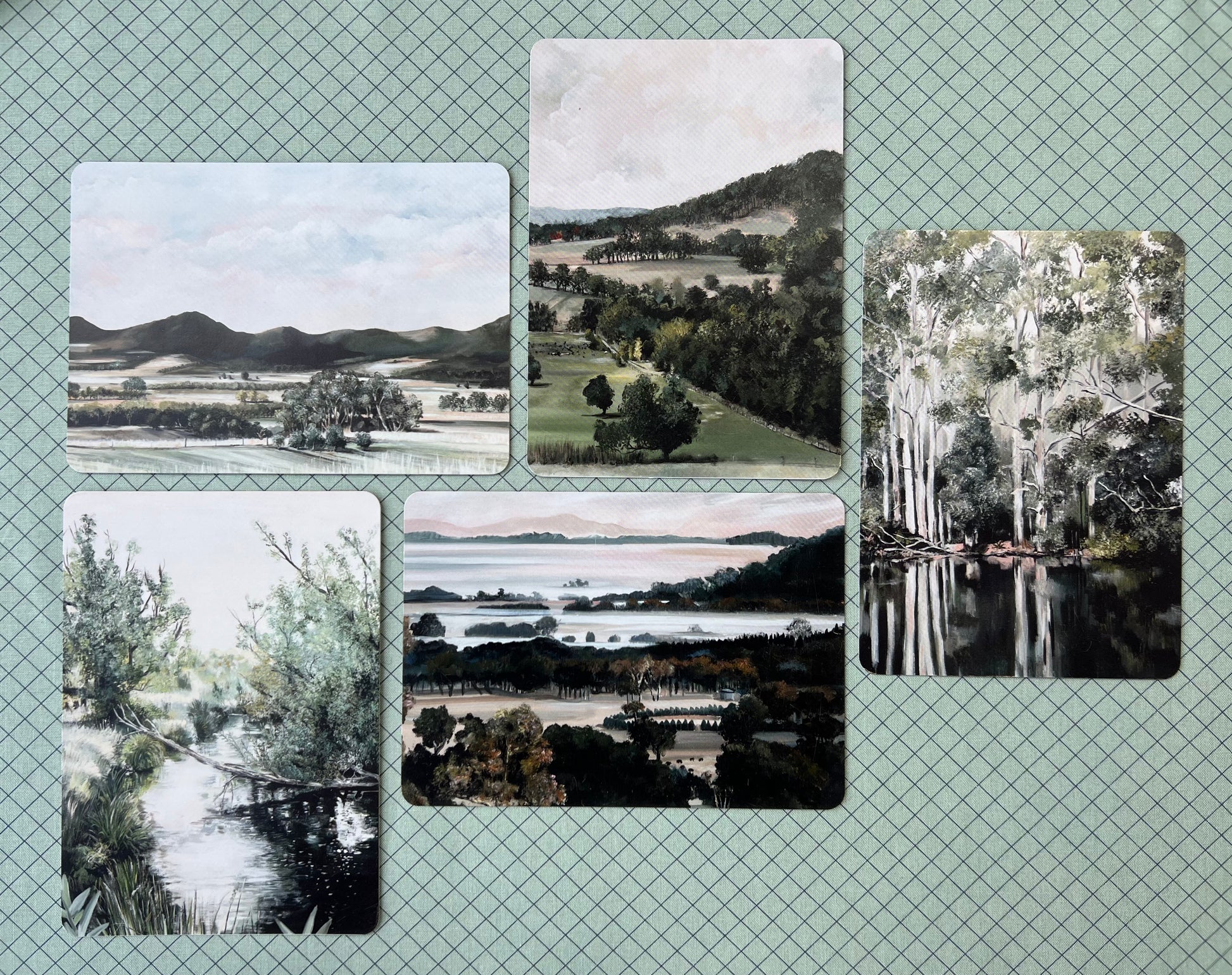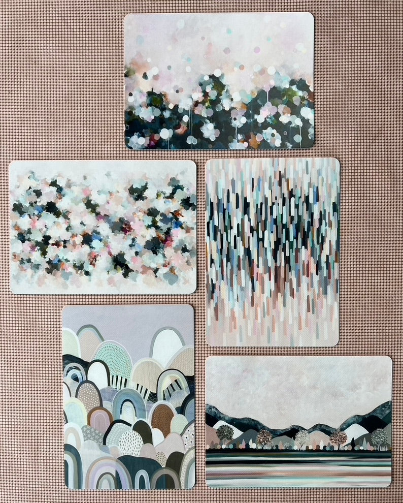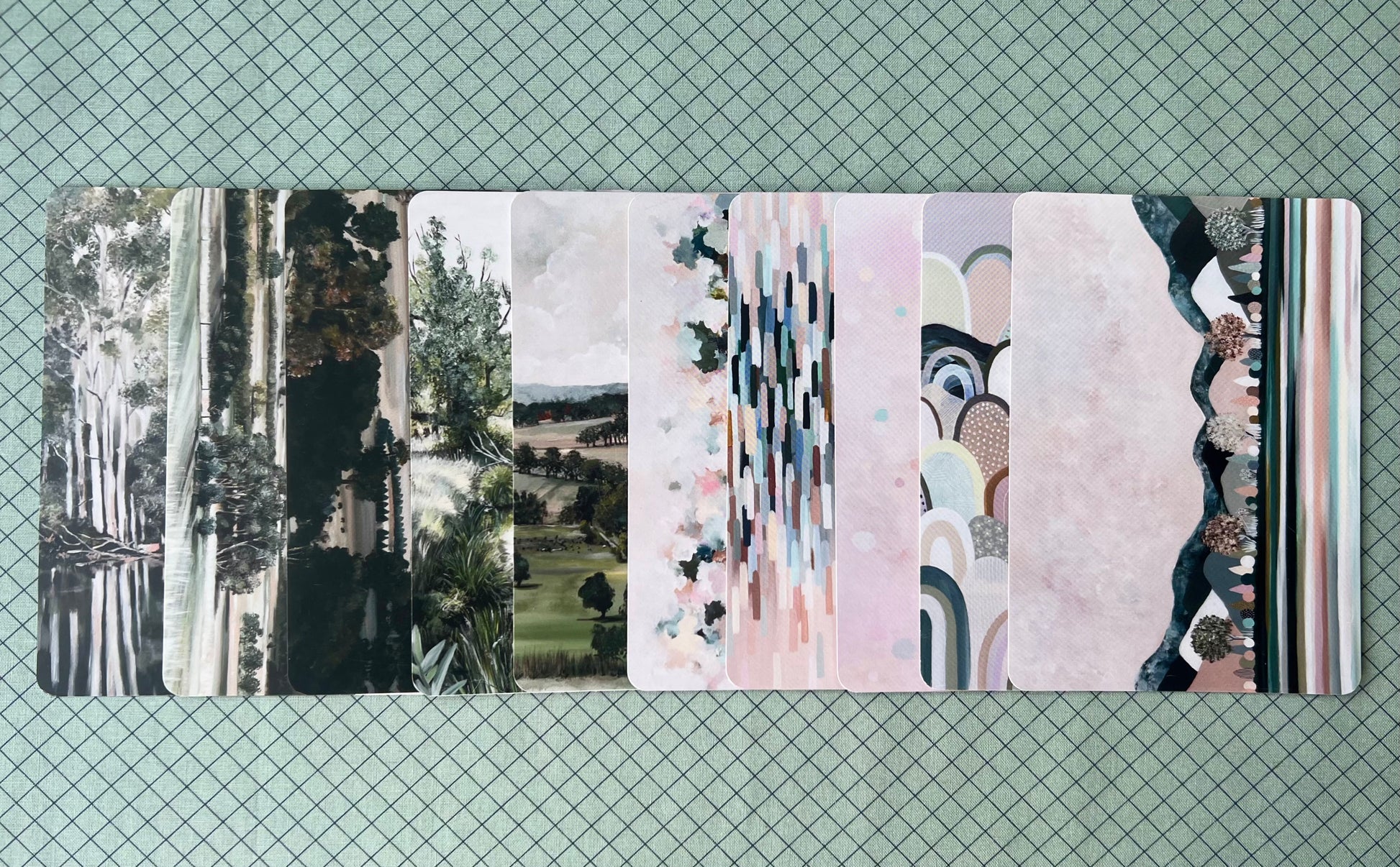 All postcards are a standard Australian A6 size (105 x 148.5 mm) with rounded corners. The backs of the postcards feature the name of the artwork, and Jessie's distinctive signature, discreetly printed on the bottom edge.